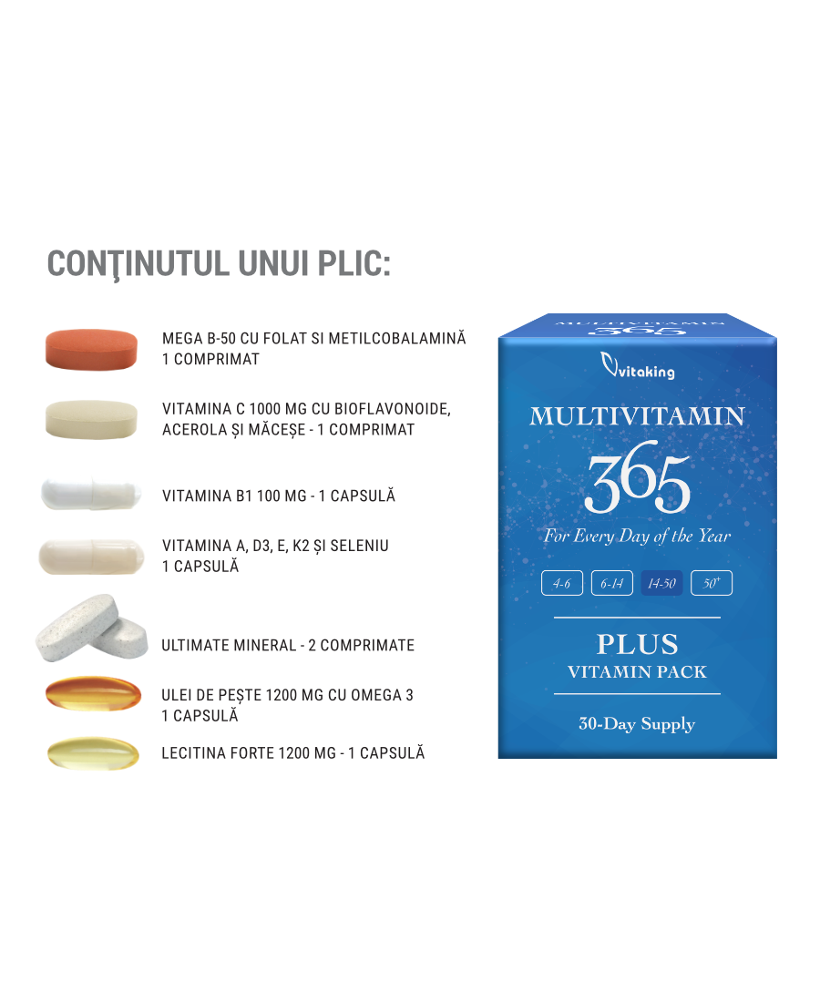 Plic zilnic complet: vitamine B1, B-50, C 1000 mg, A, D3, E, K2, minerale, Omega-3 și Lecitină Forte. Suport pentru energie, imunitate și vitalitate.